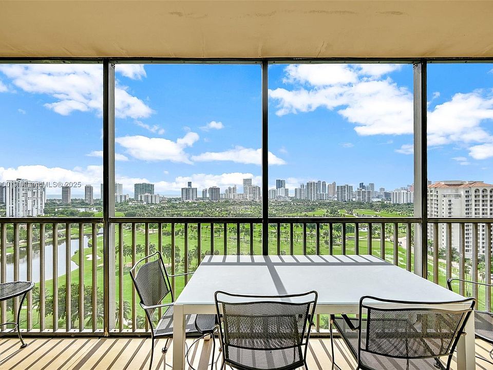 Aventura golf courseModern white cabinetryDedicated home officeElegant quartz countersCity skylineAccordion shuttersRemodeled kitchen