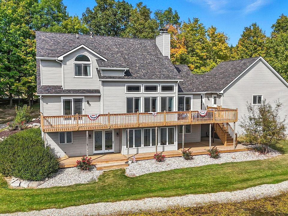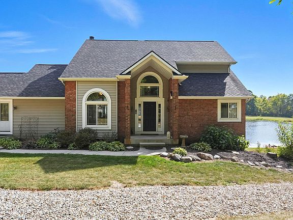 Custom 4 bed, 6 bath home on 2.5 acres with private 9-acre lake between Auburn & Fort Wayne. Features a main-level primary suite, cathedral ceilings, 3 fireplaces, and a brand-new wraparound 2-level deck with stunning sunrise & sunset views. Walkout basement offers full 2nd living space with kitchen, family room, bedroom, laundry & more. Updates include newer roof, windows, patio doors, appliances & countertops. Move-in ready—your private retreat awaits!