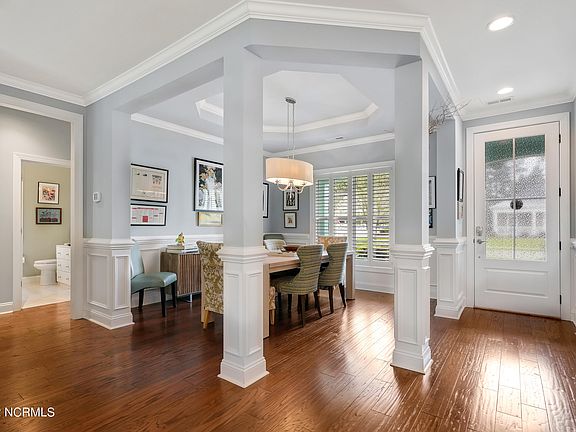 This stunning home is a customized Sanderling Model, by Jordan Built Homes, and is found in the Park Landing neighborhood of Brunswick Forest. The many upgrades create a stunning 3-bedroom, 2.5-bathroom home with formal dining room, glassed in sunroom room with solar shades, and a spacious family room open to the kitchen. Hardwood floors grace the main level of the home and luxury vinyl plank flooring is found throughout the second level. Elegant plantation shutters are found on all interior windows. You will find trey ceilings in the dining room and owner's suite as well as upgraded moldings in all the main areas. The bright kitchen includes an island with counter-height seating, quartz counters, tile backsplash, natural gas stovetop with hood vent, and 42'' white cabinets. The living room, with a graceful natural gas fireplace flanked by built-in bookcases and cabinetry, is an inviting area to relax or entertain. The serene owner's suite is complete with dual vanity, tile and glass walk-in shower, private water closet, and large walk-in closet. Additional bedrooms also have hardwood floors, ceiling fans, and ample closet space. On the second level you will find the art studio/bonus room, as well as an additional room which would be great as an office/flex room. There is also a convenient half-bath located on the second level. A laundry room, two-car garage with utility sink, and tankless natural gas hot water heater, are also features of the home. Enjoy time outside on the rocking chair front porch or in the fabulous backyard! There are three patio areas, a natural gas fire-pit, and pergola surrounded by mature greenery and landscaping. Home has a termite bond with Bug-N-A-Rug. HOA for this neighborhood includes lawn maintenance, and amenities. Features of Brunswick Forest: 3 outdoor pools, 1 indoor pool, Fitness & Wellness Center, 2 cardio/weight rooms, tennis, basketball & pickleball courts, Hammock Lake, walking trails, parks, playground, dog park, and more.