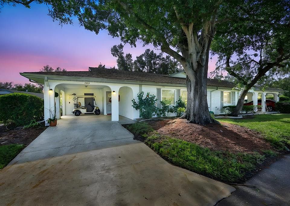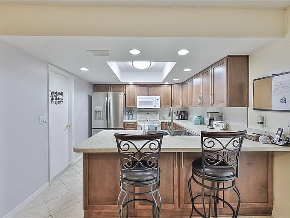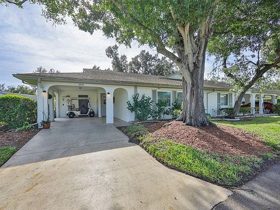 Welcome to this beautifully upgraded Brentwood I located in the highly sought-after Kings Point community of Sun City Center. This inviting home showcases elegant upgrades throughout, starting with the kitchen and bathrooms featuring richly warm Mahogany cabinets and an angled porcelain tile floor that adds depth and sophistication. A spacious enclosed Florida Room enhances the living space by approximately 200 additional square feet, offering tranquil views and the perfect spot to relax or entertain. The large master bedroom includes a cozy bay window seat overlooking a majestic oak tree, a walk-in closet, and abundant natural light. Custom window treatments, Leveler blinds, and ceiling fans in every room add both comfort and style. Additional highlights include hurricane-rated windows, extra storage cabinets in the kitchen and laundry room, new refrigerator and dishwasher, and a new AC installed in 2021. The home sits on a tree-shaded lot with no rear neighbors and offers peaceful water views from the Florida Room. Kings Point delivers a true resort-style lifestyle with multiple clubhouses, indoor and outdoor pools, fitness centers, pickleball, lawn bowling, golf, cafés, and over 200 social clubs. Dedicated golf cart lanes make it easy to access local shopping, dining, and medical facilities. Your condo fee covers nearly everything—lawn care, roof, exterior painting, pest control, cable TV, Internet, water, sewer, insurance, 24-hour guard-gated security, and transportation—making this the perfect seasonal getaway or full-time residence. Located just minutes from shopping, dining, and award-winning medical facilities, and less than 45 minutes from Tampa, Sarasota, and the Gulf beaches. Schedule your private tour today and discover the best of Florida living at Kings Point!