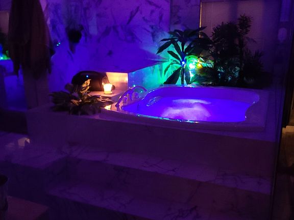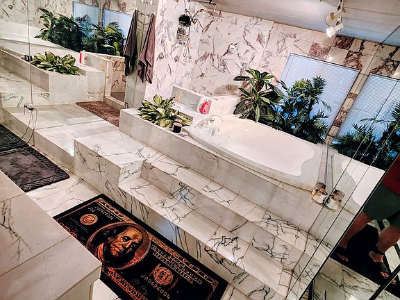 Mostly all done in marble, hardwood floor in bedroom. Bathroom is done in marble mirror to mirror walls floor to ceiling mirrors.