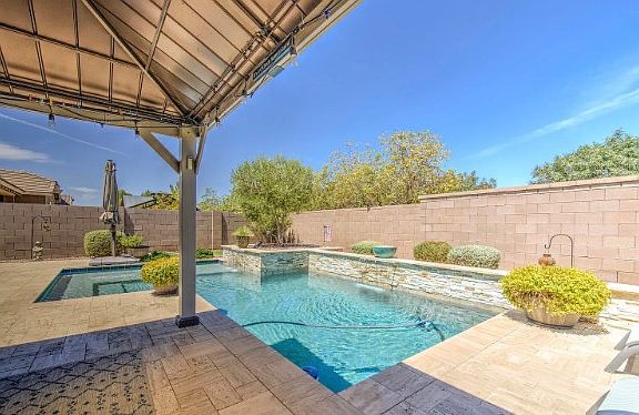 Escape to your private sanctuary outdoors: a shimmering pool with waterfall feature, surrounded by lush grass and desert landscaping, paired with a gazebo-style patio offering cozy lounge seating and an outdoor table for year-round enjoyment.