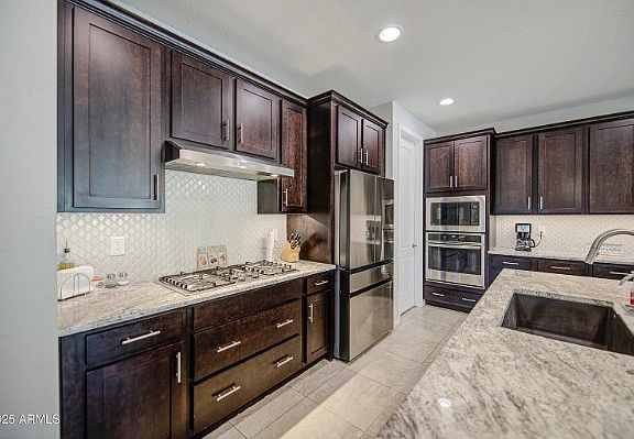 Gas stoveEn-suite bathroomDesert landscapingLush grassBreakfast barCasual dining areaSleek shaker cabinetry