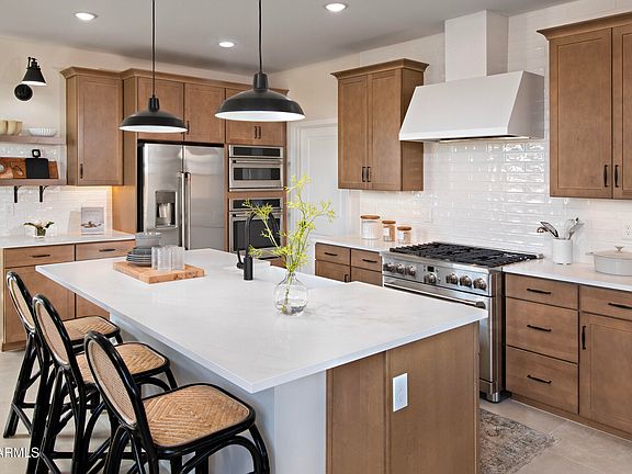 ~Special CASH Pricing Available $398,990~ Victory at Verrado, a 55+ Community gives you a premier lifestyle with actives and more!! This beautiful, Move-in Ready, Calder floorplan is expertly designed with our Loft inspired 'Looks' interior selections. The well-appointed kitchen features Calacatta Abrezzo quartz counters, Quill-stained cabinets with 42'' uppers, a large island accented with pendant lighting, and GE stainless steel appliances including your French door refrigerator. The bright open great room with coffered ceiling and adjacent covered patio is ideal for relaxing and entertaining. The stunning primary suite includes a resort like bathroom with dual sinks and a no-step shower with dual shower heads and tile to the ceiling! Fully landscaped backyard with a cozy paver patio!