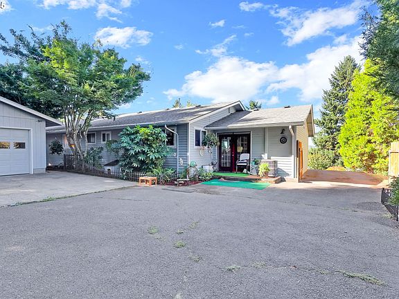 This single-level home combines comfort, character, and beautiful sunset views! The living room features vaulted, beamed ceilings, a gas fireplace, built-in shelves, Brazilian cherry floors, and access to the covered back patio.The kitchen offers Brazilian cherry floors, tile counters and backsplash, a pantry, a new dishwasher, gas range, and abundant natural light. Bedrooms have oak hardwood floors, and the primary suite includes a private bathroom. The main bath features a relaxing jetted tub, while a cozy family room adds extra living space. Step outside to enjoy the front deck, a covered back patio with an adjacent hot tub, a detached 2-car garage, and mature landscaping. Tucked on a quiet, non-through street in a great Southwest Eugene neighborhood! OPEN HOUSE: SUNDAY, October 5th, 12–2:00 PM