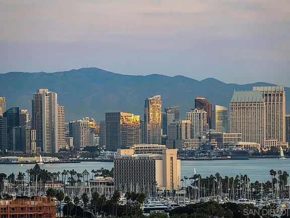 Introducing this one of a kind striking California modern masterpiece envisioned by local architect Daniel Geiger, AIA. This extraordinary residence blends architectural artistry with everyday livability, offering an unmatched fusion of luxury, function, and effortless entertainment. Crafted with low-maintenance, modern materials, the home's bold exterior pairs crisp white plaster with walnut-toned accents, exposed structural steel, and expansive glass walls. The result is a visually dynamic façade that frames a curated journey through panoramic views of the San Diego skyline—an immersive architectural experience as much as a home. Step inside from the third-floor foyer and be instantly captivated by sweeping bay vistas and an abundance of natural light, softly diffused by a louvered canopy above the primary suite's balcony. The primary retreat is nothing short of a sanctuary: a private haven with commanding views of the downtown skyline and bay, and a cantilevered terrace complete with a fire pit—perfect for serene evenings under the stars. The spa-inspired primary bath is a luxurious escape, featuring heated floors, a steam-equipped shower, a sculptural freestanding tub with uninterrupted views, and a spacious custom walk-in closet. Movement through the home is guided by a show-stopping stairwell with waterfall-edge treads and a sleek mixed-metal handrail. A thoughtfully integrated finely appointed elevator adds both refinement and convenience, effortlessly connecting all levels. On the main floor, a dramatic open-plan living area takes center stage. Towering 13-foot Fleetwood sliding glass doors open wide to a vast cantilevered terrace, dissolving the boundary between indoor and outdoor living. Here, enjoy unobstructed, jaw-dropping views of downtown San Diego, the bay, Coronado, and even Mexico on the horizon. The chef’s kitchen is equipped with top-tier appliances and thoughtful design details: custom cabinetry, a 6-burner Wolf rangetop with griddle, panelized Miele dishwasher, Sub-Zero side-by-side fridge and freezer, and a discreet walk-in pantry. Nearby outdoor spaces feature a built-in BBQ station nestled against a dramatic wood grain board-formed concrete wall and a buffet-sized natural quartzite serving counter perfect for outdoor entertaining. The home features four spacious bedrooms, a media room, a family room, a living room, and three and a half impeccably appointed bathrooms—each crafted with its own character, blending elevated design with warm functionality. This is more than a residence—it's a living work of art, designed for those who appreciate bold architecture, sophisticated luxury, and unforgettable views. Welcome to your front-row seat to San Diego’s skyline.
