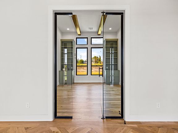 Tucked at the end of a quiet cul-de-sac on over 2 acres, this 4,266 sq. ft. Fourlight Custom Home combines privacy, sweeping ranchland views, and a thoughtful floor plan built for everyday life and entertaining - all packed into a luxurious Modern Hill Country palette. A long driveway with cul-de-sac turnaround makes guest arrivals effortless, while the exterior’s Hardi trim, upgraded brick and stone, and cedar porch ceilings create timeless curb appeal. Through wrought Iron Haus French doors, you’re welcomed into a grand foyer with soaring 12’ ceilings. Ahead, the frameless-glass study with ceiling beams and built-in bookshelves doubles as a stunning retreat or home office. The great room opens with floor-to-ceiling windows framing the landscape and a 4-panel 8’ Andersen slider that disappears to the covered porch—ideal for sunsets, hosting friends, or watching kids play.