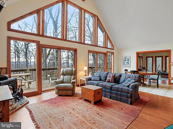 Nestled in the woods with scenic mountain views, this charming chalet home offers the perfect blend of tranquility and modern comforts. As you step inside, you're welcomed by soaring two-story windows in the living room, filling the space with natural light and offering a view mountain view. A cozy woodstove adds warmth and ambiance, making this the ideal place to unwind. The living room, dining room, and sunroom all feature beautiful wood floors, enhancing the rustic charm of the space. The open-concept design flows into the dining room and kitchen, where you'll find a breakfast bar perfect for casual dining or entertaining. The expansive deck, accessible from both the living and dining rooms, provides the perfect spot for outdoor relaxation, whether you're enjoying your morning coffee or taking in the sunset or sunrise over the mountains. For a serene escape, the sunroom features floor-to-ceiling windows and a beautiful wood ceiling, offering a peaceful space to enjoy nature year-round. The main floor includes two comfortable bedrooms and a full bathroom, providing ample space for family or guests. Upstairs, the loft area offers flexibility for a home office or reading nook. The primary bedroom is a true retreat, featuring a sitting area and an adjoining full bath, ensuring your own private sanctuary. Surrounded by nature, you'll have the pleasure of watching local wildlife right from your windows. Paved roads lead you to nearby amenities, including the state park where you can enjoy a variety of outdoor activities. Golfing, a lake with a beach area, basketball courts, hiking trails, a nature center, and even a restaurant are all just a short drive away. This home is a true gem, offering peaceful living in a stunning natural setting with easy access to recreational opportunities. Don’t miss out on the chance to make this mountain retreat your own!