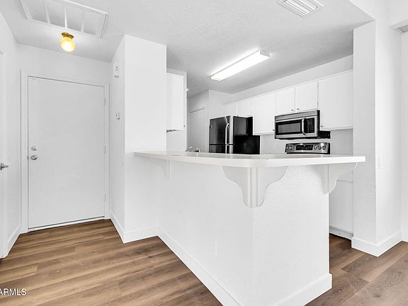 New laminate floors, all new paint, and both bathrooms updated. Conveniently located in the heart of Tempe close to all of the action and employers at ASU, Tempe Marketplace, Mill Avenue, and the Light Rail. This turn key condo is just 7 miles from Sky Harbor airport. It offers a bright open floor plan with vaulted ceilings. It opens to a dining area and kitchen with white cabinets, a space saving counter with room for stools, stainless steel refrigerator and appliances, and inside stackable washer and dryer. The patio has treetop views and extra storage space. There is a sparkling blue community pool to enjoy just a few steps away and the low HOA fee covers water, trash, roof, and blanket insurance. The condo also comes with a covered assigned parking spot. Would rent around $1650/mo.