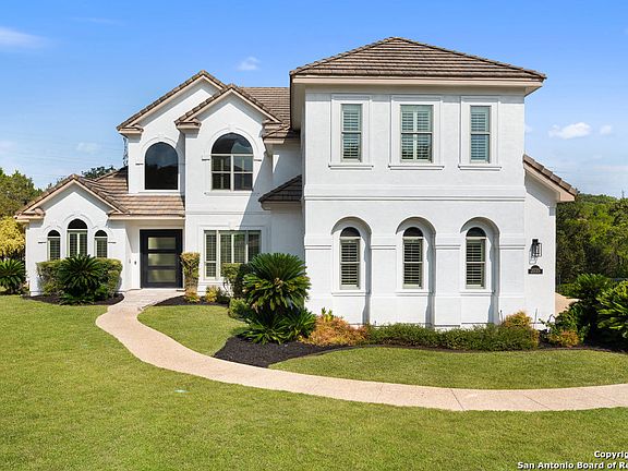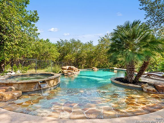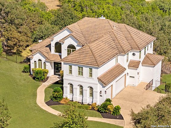 First time on the market! This stunning Mediterranean-Tuscan inspired home in Tuscany Hills is set on a .74-acre wooded greenbelt lot, offering beauty, privacy, and resort-style living. Thoughtfully designed by the original owner, the home spans 4,434 sq. ft. with 5 bedrooms, 4 full baths, and a powder bath. Inside, discover ultra-high ceilings, expansive picture windows, and transitional styling that blends warmth with modern elegance. The floor plan features a secondary bedroom and full bath downstairs, with a spacious game room and flex space upstairs-perfect for today's lifestyle. Step through the impressive custom metal and frosted glass entry door into open, light-filled living spaces that flow seamlessly to the outdoors. The backyard is a true retreat with a Keith Zars pool and spa featuring beach entry and water features, surrounded by lush landscaping, an expansive covered patio, and elevated deck-ideal for entertaining or quiet relaxation. Additional highlights include a three-car garage, generous storage, and a premier location in one of North San Antonio's most desirable gated communities.