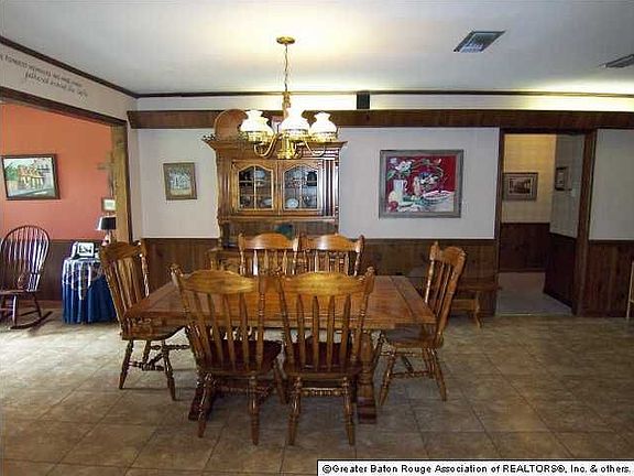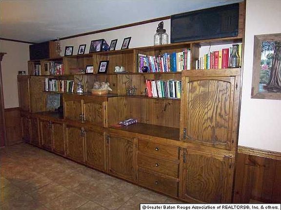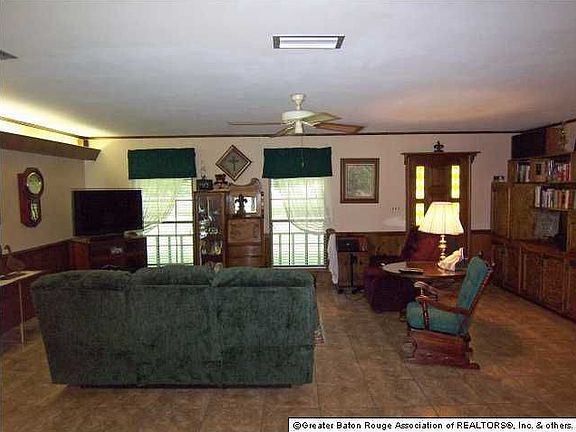 Situated on over 8 beautiful acres, in the heart of Zachary (with it's great school districts!), this home has an amazing amount of storage, a 2 car garage, a separate 1200 sq ft workshop as well as a concrete slab ready for a mobile home! The house features an open floor plan with plenty of windows to enjoy the tree shaded views. The living room features a wall of built-ins, and is open to the dining area and the kitchen. The kitchen features updated appliances including DW ( 2011 - stainless steel insides!), flat cook top, range hood, and microwave, a breakfast bar, nice cabinets, and pantry, plus the refrigerator remains! The original breakfast area is now a sitting area w/wood burning stove. The spacious bedrooms all have excellent closet space and berber carpet. The master bedroom has French doors leading to the original 'Hot Tub' room, which is now a gameroom. The master bath has an L-shaped vanity. The gameroom has ceramic tile floors and a water stub out and 220V electrical outlet. The laundry area has freezer space, cabinets, a sink, and a half bath. The home has solar screens on the majority of the windows. You'll have fun entertaining from the huge back porch and patio. Some of the other features of the home include a monitored security system, speaker wires in the gameroom, living room speaker wires to the porch, a sewer treatment plan (5 year old with new motor in 2010). Workshop is in as is condition. One of the water heaters in the house is also new in 2011