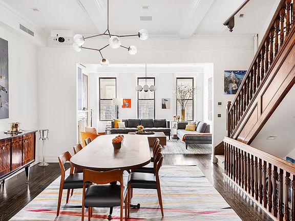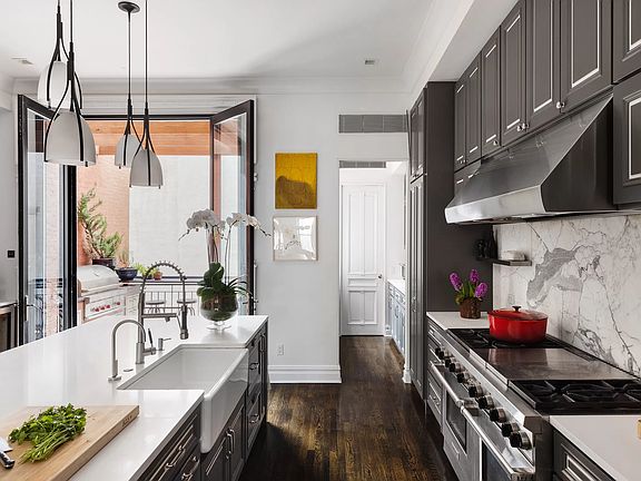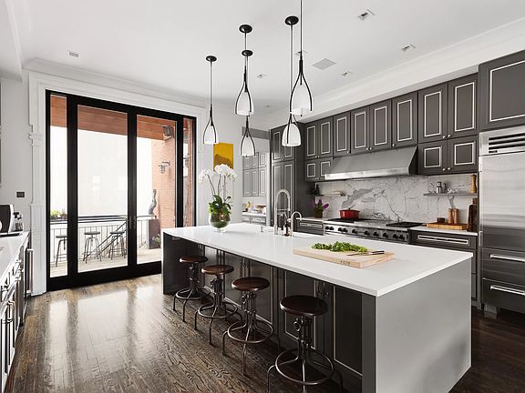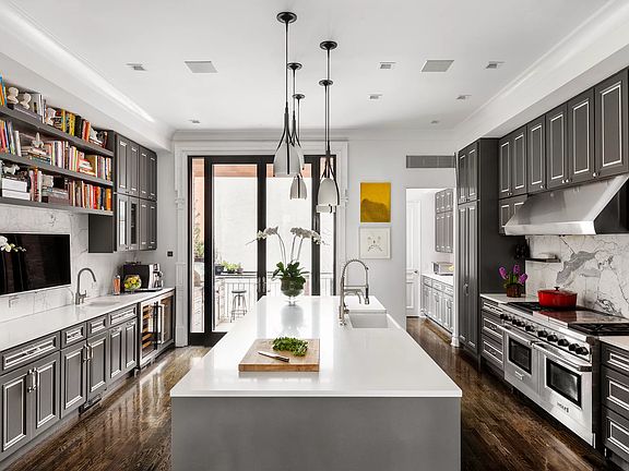 A meticulous restoration led by award-winning architect, Jeffery Povero of Povero&Company, results in this immaculate 20' wide, 5-bedroom, 6-bathroom single-family townhouse, featuring approximately 8,000-square-feet of light-flooded interiors with gorgeously restored woodwork and custom details. Upon entering the home's parlor floor you are greeted with soaring 12' ceilings, original dark-wood wainscoting and a gracious central hallway that leads you to the back parlor lounge outfitted with one of three gas fireplaces throughout the home. The centerpiece of this room is a vintage bar that was sourced from an old hotel and restored with new appliances, plumbing and electrical including two running, built-in taps. A fully stocked butler's pantry allows for the convenience of easy entertaining. Original double doors lead you to one of the home's four outdoor spaces - a stunning 500 sqft terraced garden. The elegantly restored wood staircase leads you up to a sun-drenched, loft-like living and dining area overlooking 5th Avenue. The adjacent pro-grade kitchen, which can be closed off by two custom pocket doors for entertaining, is every chef's dream! It includes custom cabinetry, a massive island countertop with a farmhouse sink, two side-by-side 6-burner Wolf ranges, a Sub Zero refrigerator/freezer, separate beverage refrigerator, wine refrigerator and an oversized pantry. Two floor-to-ceiling glass doors open to an intimate outdoor deck with a built-in grill for al fresco dining. The third floor features the Primary bedroom suite which hosts a gas fireplace, custom walk-in-closet and a stunning five fixture bathroom outfitted with Nero Marquina marble, a double vanity and separate water closet. Right outside the door is a private, outdoor Jacuzzi which provides a quiet respite in the city. After a soak, step into the cozy library/den for a quiet read or movie night. The top floor features three additional bedrooms and two bathrooms, as well as a large laundry room and a magical, "hidden" office. Atop this five story home is a magnificent fully furnished roof deck with a built-in grill, a dining table for 8 under a wood pergola and an irrigation system to maintain the lush garden and landscaping. The garden level of the home is currently used as a production office and includes a ten seat home theater. The basement has a rec room, wine cellar, workshop/gym and plenty of storage. Additional modern features to this historic home include central AC, Lutron lighting throughout as well as a home automation Savant system. 2036 Fifth Avenue is located a block from the great thoroughfare of 125th Street, a vibrant boulevard lined with restaurants, shops and cultural icons such as the Studio Museum of Harlem and the world-renowned Apollo Theater. Central Harlem is one of New York's most historic neighborhoods, an early 20th century mecca for music, dance and nightlife. Surrounded by historic blocks of townhouses and adjacent to pocket parks and tree-lined streets.