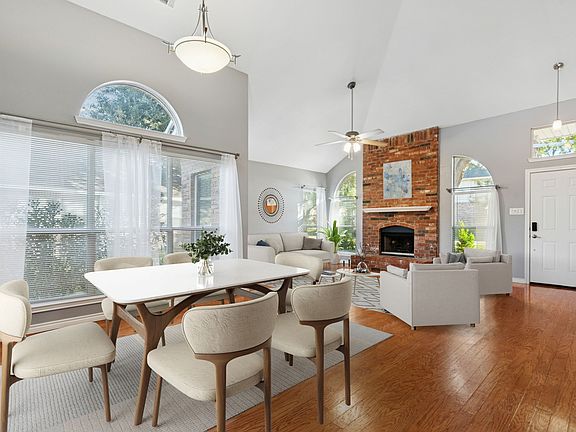 Floor-to-ceiling brick fireplaceSerene backyardPrivate backyard oasisStainless-steel appliancesWalls of windowsHardwood floorsFormal dining area