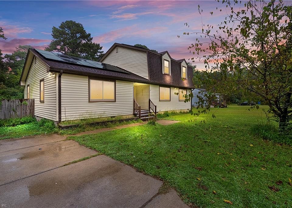 Make this your first stop! Amazing opportunity priced to sell. This Single Family Home is located in the Desired Deep Creek area of Chesapeake situated on nearly ½ Acre Lot! With over 2,400 Square Feet of Living Space this 4 Bedroom, 2 Full Bathroom Home has ample space to grow. This home boasts a Large Kitchen, Family Room, Detached 1 Car Garage and Updated Bathroom showers.! Roof installed in 2016, Fenced Backyard, and 2 Storage Sheds. Solar panels installed in 2023 and will be paid at closing. Centrally located with easy access to multiple interstates, shopping and military installations!