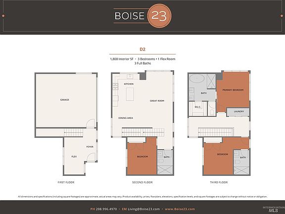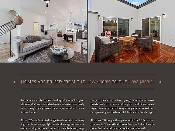 Luxury new-build close to downtown and minutes from parks. Boise23 delivers high-style, low-maintenance luxury living in vertically conceived single-family townhomes offering ingenious floor plans and elevated interior finishes. Large and plentiful windows throughout your residence invite ample natural light and wide-open views. Your 1st floor features a flex room, perfect for an office, workout room or whatever fits your wants and needs, connecting to your spacious 2-car garage. Walking upstairs you will find a light-filled open floor plan: kitchen, dining area, tech desk and an expansive great room that is adjacent to a full bathroom and guest bedroom. The 3rd floor features the master bedroom and an additional guest bedroom. The 5-piece primary bath features a luxurious freestanding soaking tub, eye-catching finishes and a walk in closet.