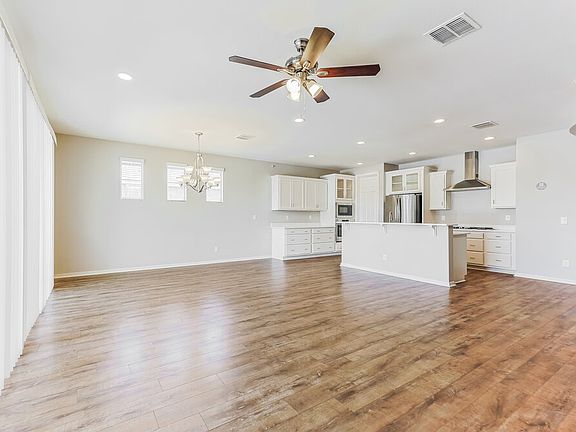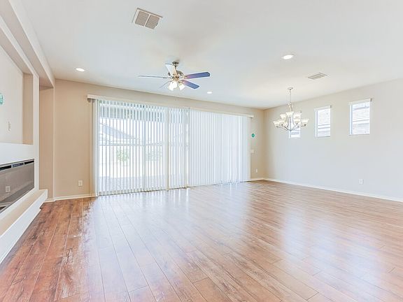 This move-in-ready Queen Creek, AZ rental home has three bedrooms and two bathrooms. Step inside to find a gorgeous open-plan layout with travertine flooring and double sliding glass doors in the sunlit living room. Notice the modern gas fireplace and the media nook. The kitchen is impressive, with all-white cabinetry, double wall ovens, and room to spread out over a huge center island. In the adjacent dining area, you'll enjoy your meals underneath a traditional chandelier. The main bedroom is at the rear of the home, offering privacy from the additional bedrooms. A walk-in closet with lots of shelving offers plenty of space for storage, and there's also an en suite bathroom with the luxury of two vanity sinks. Come tour this property on a private walk-through soon!