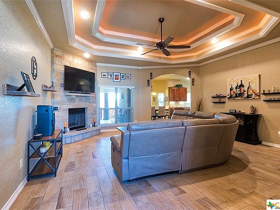 Move up to spacious style in this beautiful home in a great location. The superb curb appeal is boosted by extensive landscaping, a 3-car garage, and the brick and stone exterior. The wide open backyard has some shade trees for year round comfort and a covered patio and built-in kitchen area. Gorgeous wood-look tile floors begin in the welcoming foyer and extend throughout. Gather in the great room with a double tray ceiling with crown accents and a corner stone fireplace with mantle. An arched entry leads to the gourmet island kitchen with granite counters, beautiful cabinets and double built-in ovens. Another double tray ceiling with crown and light accents highlight the owner's suite bedroom and the bathroom has a walk through shower with dual heads and a central jetted tub. Additional amenities include a sprinkler system and a security system.