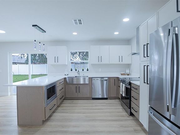 One or more photo(s) has been virtually staged. Step into a stunning showcase of contemporary design and elegance. This fully renovated home stands apart in the community, blending natural light and soaring double-height ceilings to create an inviting sense of spaciousness the moment you enter. Enjoy open-concept living anchored by a top-tier custom kitchen with quartz countertops, a dramatic peninsula, and premium stainless steel appliances—perfect for entertaining or family gatherings. The smart, flexible floor plan offers five bedrooms and three-and-a-half baths, including a private downstairs guest suite with nearby full bath. Retreat to your expansive owner’s suite featuring a spa-inspired bathroom with double vanity, oversized shower, separate water closet, and a walk-in closet designed for convenience. All secondary bedrooms are generously sized and filled with sunlight, making every room bright and comfortable. Recent upgrades include a new AC, energy-efficient windows, water heater (all 2025), and a newer roof (2018)—adding peace of mind and nearly turnkey perfection. Every detail—from flooring to fixtures—has been selected to exceed expectations and deliver unmatched quality for the price. Don’t miss your opportunity to experience refined living in this standout community address. Schedule your private showing today and discover the new benchmark for modern living.