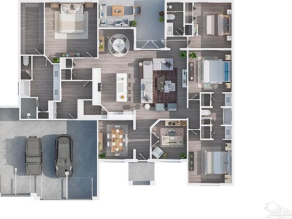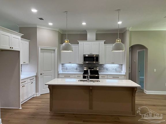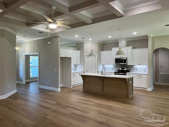 Stunning New Custom Home in Holley by the Sea – Estimated Completion February 2026 Experience luxury coastal living in this brand-new custom-built Robbins Builders home, ideally located on a quiet cul-de-sac in the sought-after Holley by the Sea community. Residents enjoy resort-style amenities including multiple pools, a fully equipped gym, tennis courts, a waterfront park, and deeded access to the Santa Rosa Sound. This 4-bedroom, 3-bathroom tri-split floor plan showcases timeless craftsmanship and modern design. The welcoming foyer opens to a formal dining room and private office with double glass doors, leading into an expansive open living area filled with natural light and refined finishes. The gourmet kitchen serves as the heart of the home—featuring shaker cabinetry with crown molding, quartz countertops, a tiled backsplash, stainless steel appliances, and a large center island flowing into the breakfast nook and family room. A walk-in pantry offers excellent storage, while wood-look staggered tile flooring enhances the home’s modern coastal appeal. The spacious primary suite offers a tranquil retreat with a trey ceiling, ceiling fan, and spa-inspired bath boasting a tiled walk-in shower, soaking tub, dual vanities with framed mirrors, and a large walk-in closet. Two guest bedrooms share a Jack & Jill bath, while a fourth bedroom features a private bath and access to the covered porch—perfect for guests or multigenerational living. Additional highlights include a laundry room, oversized 3-car garage ideal for trucks or outdoor toys, and a landscaped yard with irrigation system, lawn pump, and digital timer. Built for comfort and peace of mind, the home includes TAEXX in-wall pest control, Fabric Shield hurricane protection, a dimensional shingle roof, crown molding, recessed lighting, and more. Enjoy a short drive to Navarre Beach, local shopping, and Hwy 98 for easy access to Hurlburt Field AFB. Don’t miss this exceptional new home—call today for details