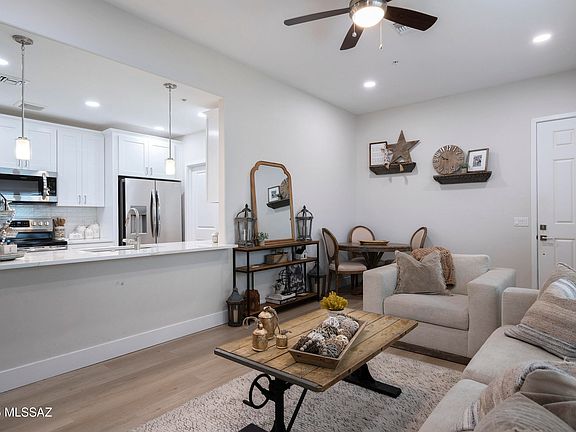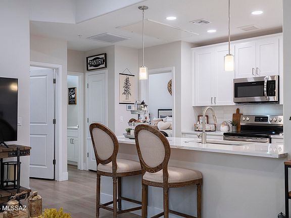 Built in 2022, this beautiful, modern, two bedroom, two bath condo would also make an excellent seasonal residence, short stay or full-time rental investment property. Truly a ''lock and leave'' property, this home is thoughtfully designed with a neutral finish palette, wide-plank flooring, ceiling fans and plantation shutters throughout. Open to the living/dining space, the kitchen features quartz counters with a breakfast bar, pendant lighting, white shaker-style cabinets, a luxe custom backsplash, pantry closet and an adjacent laundry room. The balcony off the living space offers a storage closet and mountain/ Riverwalk views. The generous primary bedroom has a walk-in closet with built-in drawers and a private attached bath with dual sinks, walk-in shower with glass enclosure and a separate toilet room. The guest bedroom is serviced by a full hall bath. Both baths are stylishly outfitted with quartz counters and on-trend vertically stacked tile. This condo includes all appliances and one carport space. Residents of Plaza Escondida also enjoy direct access to the Rillito Riverwalk paved pathways and a private pool. Your new home is located close to excellent diningUnion Public House, Reforma, Proof Artisanal Pizza and Pasta, Pure Love Juice, El Corral and Ren Coffeehouse are under 3 minutes away while in under five minutes you can dine at Sullivan's, P.F. Changs, Zinburger, Seis Kitchen and more.