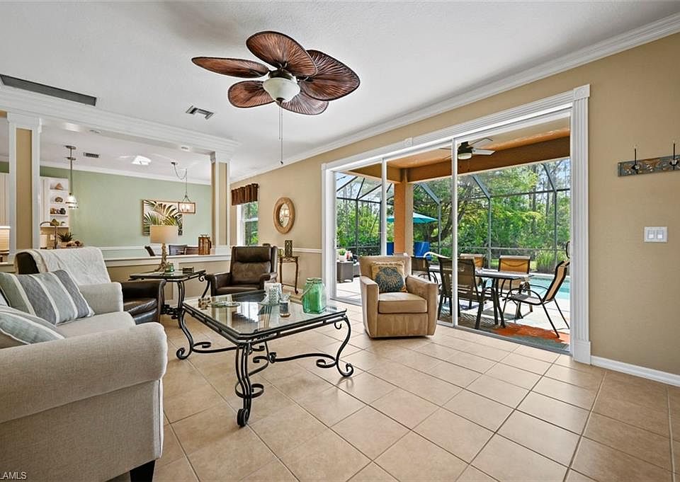 Remodeled 4-Bedroom + Den Cannondale Flex with Pool & In-Law Suite in Bella Terra Tucked into one of Estero’s most desirable tree-lined neighborhoods, this beautifully remodeled Cannondale Flex offers nearly 3,000 sq. ft. of versatile living with 4 bedrooms, a den, loft, in-law suite, and 3 full baths. The heart of the home is a tastefully updated kitchen with granite countertops, stylish backsplash, and upgraded cabinetry. All bathrooms have been refreshed with quartz countertops and new shower glass. A flexible front room with elegant French doors creates a perfect home office or private suite — easily converted back to open space if desired. The spacious downstairs den includes a full bath and direct pool access, ideal for guests. Step outside to an oversized lanai with southeast views, a heated saltwater pool, and landscape lighting that creates a magical evening atmosphere. Upstairs, the primary suite offers its own private lanai — a serene spot for coffee or evening relaxation. This home also features a newer roof (2020), freshly painted exterior, and a secure no-flood-zone location just a short walk to Bella Terra’s amenity center. Bella Terra spans 999 acres with 400 acres of preserves and 100 acres of lakes. Amenities include a resort-style clubhouse, 24-hour fitness center, resort pool and spa, tennis, pickleball, basketball, softball, bocce, sand volleyball, in-line skate rink, butterfly garden, shaded children’s play area, and a full social calendar including bingo, boot camp, water aerobics, poker, and food truck nights. Move-in ready and perfectly located — schedule your private showing today.