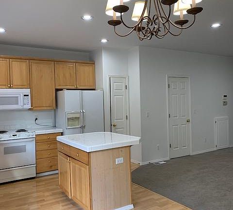 * Kitchen with tile countertops, island with eating bar, pantry, built in microwave