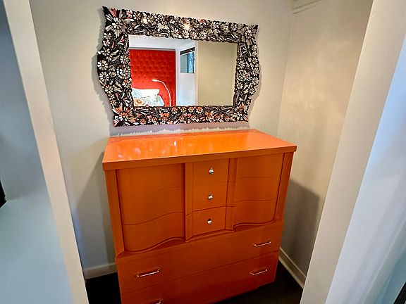 Upon entering the unit, you are in the colorful fully furnished kitchenette with a cozy retro table with cushioned seats, great for laptopping. Appliances include mini fridge, two burner stove top, microwave, toaster oven and drip coffee maker. Dishes, silverware, utensils, pots, pans etc also provided.
