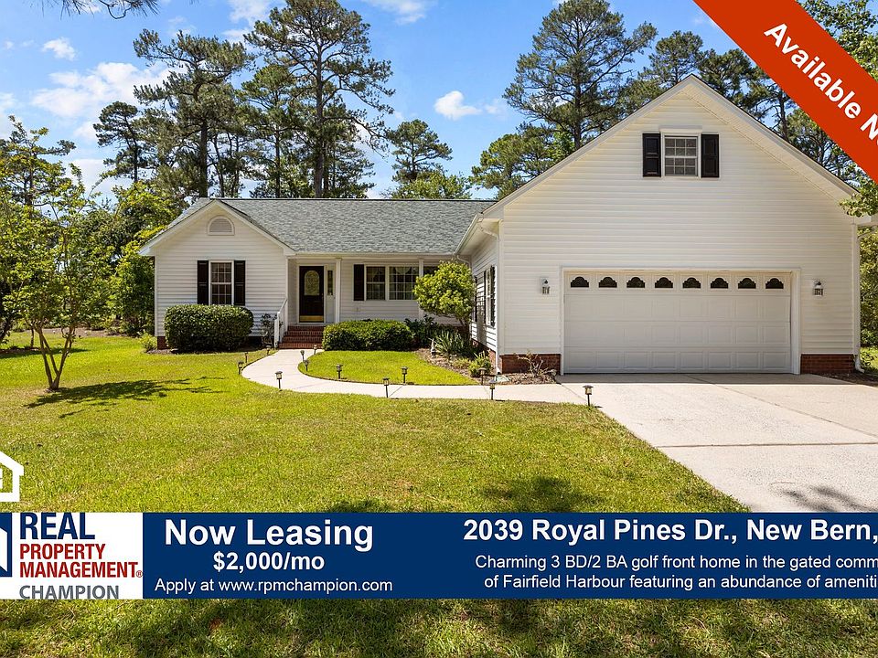 This charming 3 BD/2 BA golf front home features a spacious floorplan with bright and sunny rooms. You will enter the main living room with cozy fireplace and vaulted ceiling that is shared with the adjoining dining room with a large picture window. The kitchen offers ample cabinets and counterspace for cooking and is open to the breakfast nook and sunroom. The master bedroom has two closets with mirrored doors and a private bath with step-in shower. Two guest bedrooms and a second full bath complete the floor plan. Additional features of this home include an attached two car garage and fully floored unfinished bonus room ideal for extra storage. Located close to downtown New Bern in the gated community of Fairfield Harbour with loads amenities including Harbour Pointe Golf Course, tennis and pickleball courts, a restaurant, community center, dog park, boat ramp, walking trails, playground, and fishing pier.