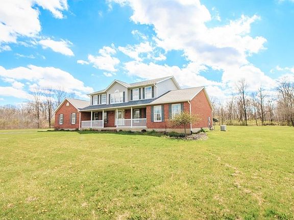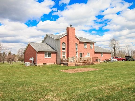 5.18 acre estate with a beautiful fruit orchard that offers apple, cherry and pear trees and a grape arbor. This brick two story home has an oversized side entry two car garage & covered front porch. Kitchen has granite counter tops and back splashes, center work island, all stainless steel appliances and ceramic flooring. Large first floor Master bedroom has a private bath with a jetted tub and shower with body sprayers. Three additional bedrooms are on the second level and a full bath. The home has stained solid hardwood doors and baseboard. The upstairs overlooks both the entry and the family room. Family room features a two story custom built brick fireplace wall with a raised hearth. First floor Laundry. Lower level is finished with a recreation room w/gorgeous wet bar, beer taps, game room, media room and a full bath. Gas heat and back up generator to handle power outages. Additional two car detached garage that is heated and has separate meters for utilities.