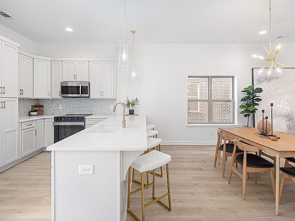 The chef’s kitchen is a true showstopper—featuring quartz countertops, a 9+ ft peninsula island, tile backsplash, custom-built soft-close cabinetry, and stainless steel appliances.