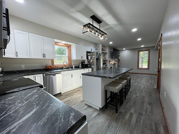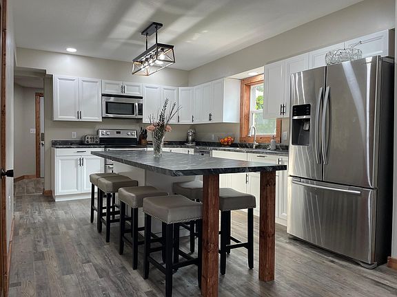 What a place! Updated 4 bedroom, 1.5 bath, 2-story home. Main floor boasts updated modern kitchen, new cabinets, large island, new counter tops, new appliances. Spacious family room with new electric fireplace provides great space to gather or unwind. Additional room perfect for home office or bedroom. Upper level has 3 good sized bedrooms along with large full bath and laundry. Updated vinyl flooring throughout. Relax on the beautiful wraparound porch or sit in the gazebo and enjoy conversations around the firepit table. Oversized heated and cooled detached garage with the perfect spot for happy hour. Additional storage sheds with kennel perfect for any pets you may have. Truly a rare find on 1.54 acres on the edge of town.