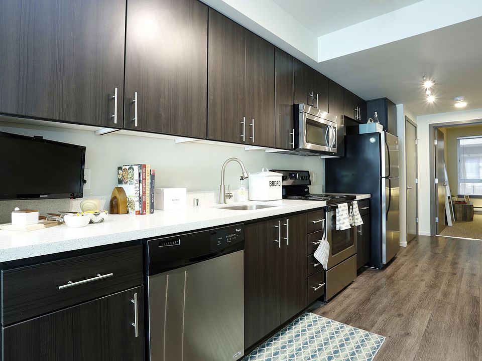 Taking shape in the shadow of the Space Needle, Aperture On Fifth presents a unique opportunity in urban apartment living. With a nearly perfect Walk Score of 97, the city is literally at your feet. Offering studio, one- and two-bedroom apartment homes, this community includes outstanding features and amenities. Stainless steel, Energy Star-rated appliances; quartz countertops; dark, walnut-stained cabinetry; luxuriant carpeting in the bedrooms; and a full-size washer and dryer are just a few of the amazing features that you will find in these brand-new Seattle apartments.