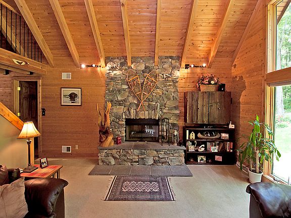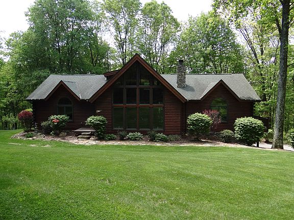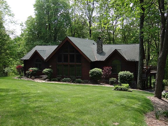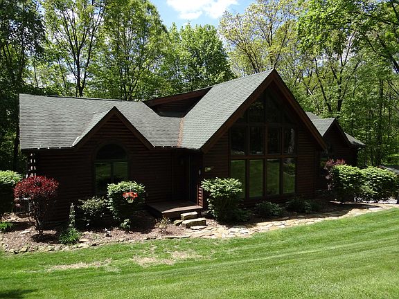 Impressive log home set on 5 acres (2 lots) minutes from Moraine State Park. This exceptional home was custom built by Mountain Creations and offers Soaring ceilings with two story windows. Stunning two sided stone fireplace. Fully equipped kitchen with glass doors leading to the expansive wrap around deck. luxurious vaulted master suite with a stone fireplace, walk-in closet and custom built=ins, glass doors leading to the deck and a fabulous bath with glass enclosed shower and whirlpool tub. Upper level loft