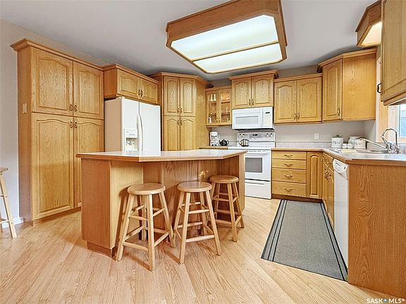 This charming Herbert bungalow offers an ideal blend of location, size, and layout. Nestled just steps away from downtown, a park, and within walking distance to the K-12 school and amenities. this home is perfectly situated for convenience and comfort. The spacious bungalow features a large front living room bathed in natural sunlight. Adjacent to the living room is a generous eat-in kitchen, equipped with custom oak cabinetry, a spacious island, ample countertop space, and abundant cabinetry overlooking the backyard.The main floor also includes a laundry room, a four-piece bathroom, and three spacious bedrooms. The lower level extends the living space with two additional bedrooms, a second bathroom, and a large family room at the bottom of the stairs. It also features an oversized secondary kitchenette, additional washer and dryer space, a storage room, and utility space. Notably, the water heater was replaced in 2020, and the interior water line was recently upgraded. Significant renovations in 2003 included a new kitchen, bathroom, PVC windows, and included updated stucco with one-inch insulation for improved energy efficiency. The backyard is a true oasis, boasting a large deck complete with a wood stove, offering a peaceful retreat. The expansive lot is adorned with mature greenery, ensuring privacy, a beautiful fountain feature, and a substantial private garden. The back yard and garden are equipped with an underground irrigation system on a timer. An 8x8 shed is conveniently located at the back of the fully fenced yard. The double car garage measures 26 x 23.5 feet with a concrete floor, and there is an additional parking pad beside it. Herbert is located right off Highway 1, just 25 minutes from Swift Current, and offers a wealth of amenities, including a K-12 school, medical facilities, grocery stores, restaurants, a pool, and more. This home presents an incredible opportunity to embrace small-town living in a great home at an affordable price.