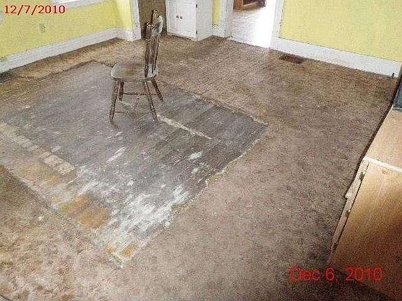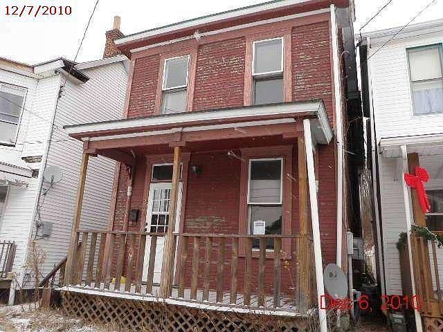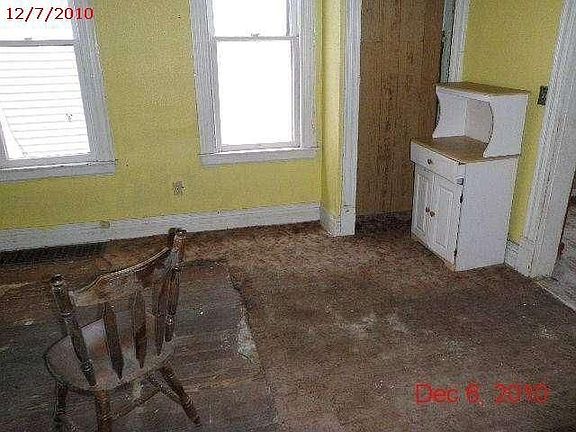 Exterior Features: Two story red & white home has fair curb appeal, paint is peeling on wood exterior walls. Wood porch in front of home, small lot, house seems in fair condition, windows are intact, roof condition unknown. Interior Features: Seems in fairly good shape, living room has yellow walls, beige carpet/wood floor. Kitchen cabinets and sink are intact, vinyl flooring, brick backsplash, looks fine. One room has some ceiling damage, appliances in bathroom are present, wood trim, is in decent shape. Beds are similar with white/crème walls, brown carpet & closet space. Brick basement with concrete floor.