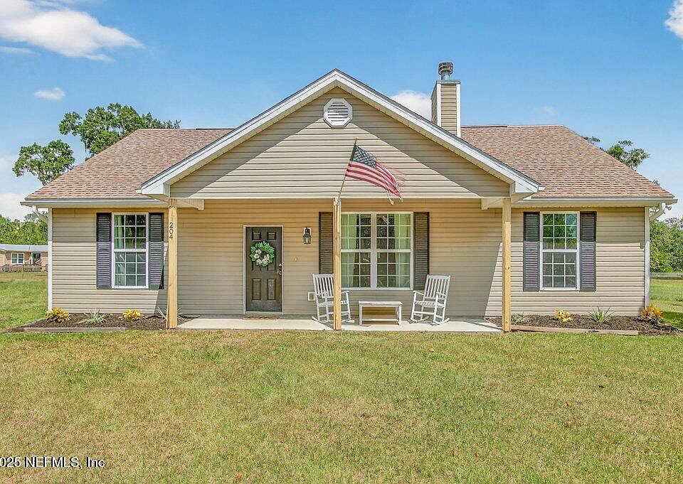 Escape to the country with this charming 3-bedroom, 2-bath farmhouse nestled on a grassy, high and dry 1.26-acre lot. Located off a paved road in an area known for larger parcels and space between neighbors, this property offers room to breathe. Step inside to a bright, airy interior with vaulted ceilings that make the home feel open and inviting. The split floor plan provides privacy and comfort across 1,583 square feet of living space, featuring durable LVP flooring and abundant natural light. The living room centers around a cozy wood-burning fireplace, while the kitchen offers generous cabinet and counter space and flows easily into the dining area for family meals and gatherings. The primary suite is a relaxing retreat with a soaking tub, separate shower, and a spacious layout. Two additional bedrooms offer flexibility for guests, family, or a home office. Outdoors, enjoy the freedom of country living with space to add a pool, garden, or play area. A massive 55' x 25' pole barn with a 12' x 50' lean to provides endless possibilitiesenclose a portion to create a workshop or host family and friends under the open-air space for evenings full of fun. With no HOA, you'll have the freedom to enjoy the property your way, and there's plenty of room for chickens or small homestead projects. The septic system was pumped and inspected in 2023 with minimal use since. Enjoy the quiet of rural life just 35 minutes from St. Augustine, 50 minutes to Gainesville, and about 25 minutes to Green Cove Springs, offering easy access to shopping, dining, and entertainment while returning home to your peaceful retreat. Blending comfort, character, and open space, this farmhouse delivers the best of country living with modern convenience.