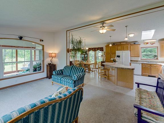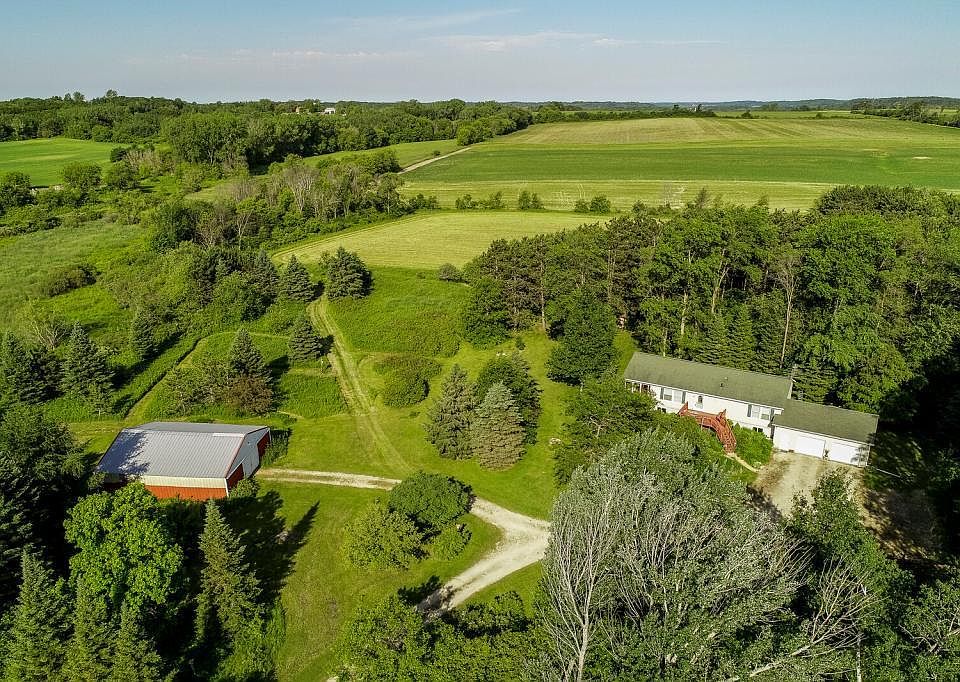 Enjoy the quiet and peaceful rural lifestyle that you have been looking for on your own 10+ country acres with an open and wooded setting that provides tranquil privacy and an abundance of wildlife.This country raised ranch home features an open and vaulted living/kitchen/dining, owner's suite, sunroom, main floor laundry, and the unfinished lower level provides plenty of room for expansion. Great space for all your storage or work needs with an oversized garage, a 45 x 36 pole building w/12 x 8 door, and a garden shed. You'll love all the established gardens, seasonal creek, apple trees, high bush cranberry shrubs, raspberry plants, and much more. A portion of the property is in the flood plain and seller is in the process of trying to remove the home from the flood plain designation, which could take up to 4 months.Home is a modular home on a foundation.