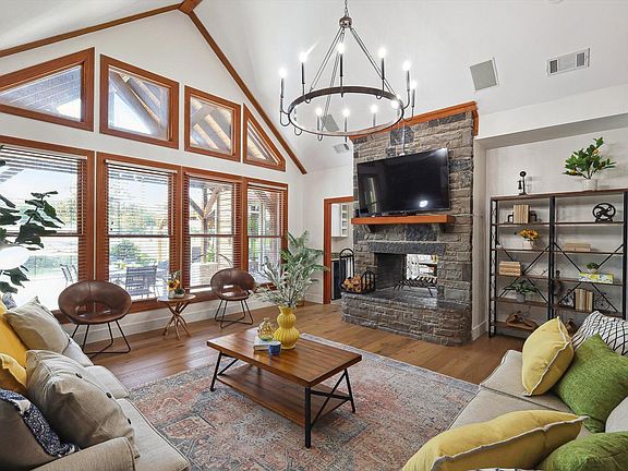 With spacious wood-lined vaulted ceilings and a centerpiece stone fireplace, this living room is the epitome of rustic charm! Spacious and airy with plenty of natural light while still offering a warm, cozy environment, embrace the allure of the south while you're here in the Lone Star State!