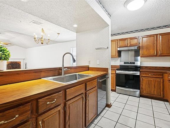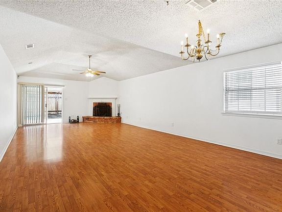 Two-car garageCovered patioDimmable wall lightingNew flooringClassic brick fireplace