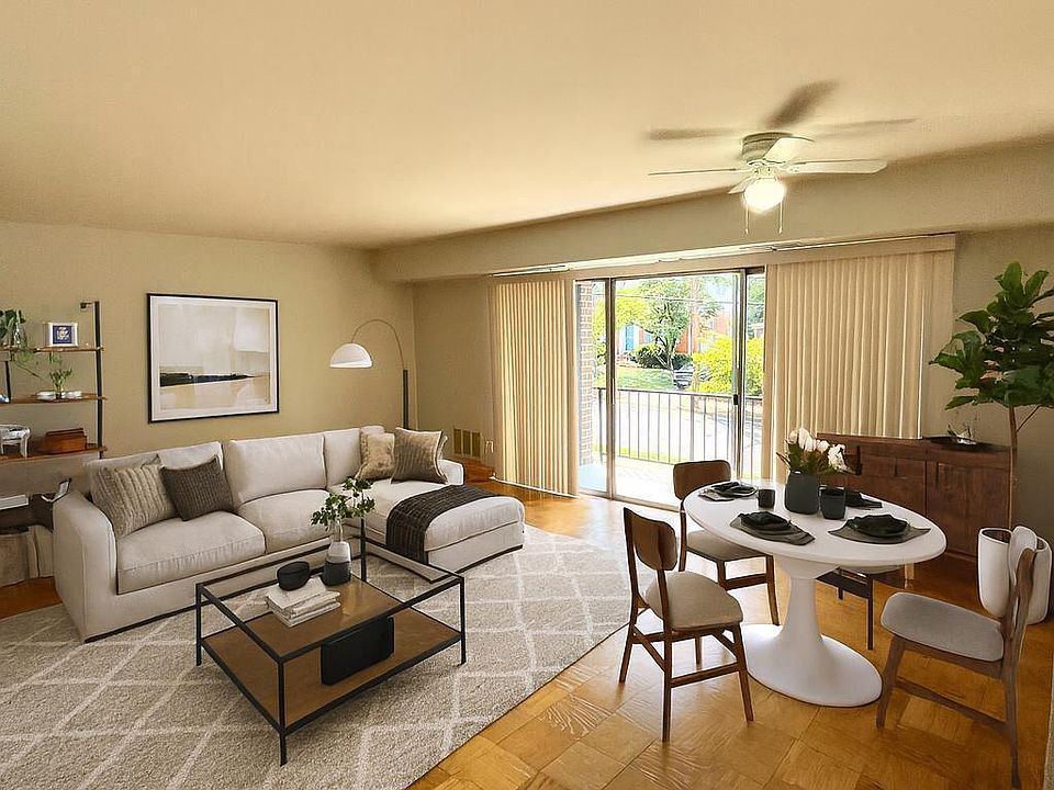Adorable, updated 2 bed/1 bath apartment just steps from "The Avenue" in Del Ray! The kitchen has been updated with new stainless steel appliances, and the spacious living and dining area features hardwood floors that open to a large balcony, perfect for morning coffee or relaxing on warm evenings. The living room photo has been virtually staged to show how the space can be decorated and furnished. Imagine the possibilities for creating a stylish, comfortable home tailored to your lifestyle. Ample closet space throughout. Leave your car in the parking lot and walk to all that Del Ray has to offer. Welcome home!