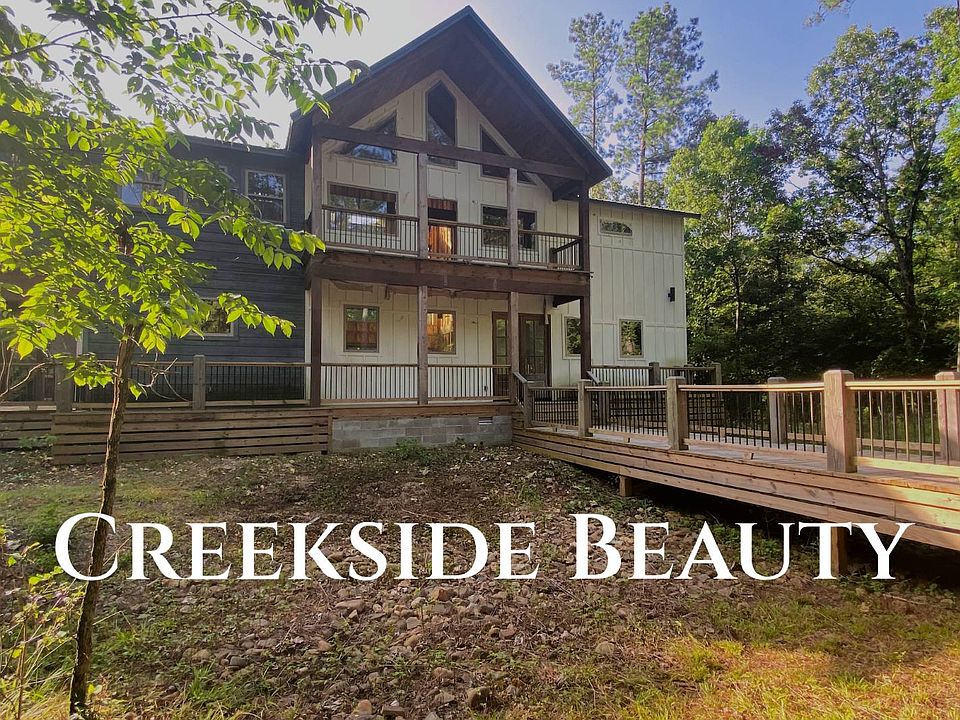 Design your dream Broken Bow retreat on a rare ~2.02-acre lot with two creeks at the end of a cul-de-sac on Eagle Pine Lane. Sold As-Is, this partially built cabin is planned at ~3,104 SF heated plus ~2,179 SF of decks/outdoor living (buyer to verify) and features 4 private bedroom suites, a separate oversized bunk room, 5.5 baths, and a lofted game room overlooking a striking two-story wall of windows. Expansive covered + open decks are mapped for dining, hot tubbing, and fireside lounging with water-feature ambiance. The walkway over the creek sets a memorable arrival. Bring your builder and finish to your taste - rustic-modern, mountain luxe, or clean contemporary. The suite + bunk layout, generous outdoor zones, and indoor-outdoor flow are ideal for hosting groups and future STR potential. Minutes to Hochatown dining, Beavers Bend recreation, and the lake. Notes: Property conveys as-is/where-is at current stage; see photos/plans. Buyer to verify square footage, utilities, septic, permits, and remaining scope to complete. Quick-Scan Highlights As-Is shell on ~2.02 acres with two creeks | cul-de-sac Plan: ~3,104 SF heated + ~2,179 SF decks/outdoor (buyer to verify) Layout: 4 en-suite bedrooms + separate oversized bunk | 5.5 baths Showpiece: two-story wall of windows | lofted game room STR-forward design: bunk capacity + big outdoor zones Minutes to Hochatown/Beavers Bend | nature + privacy As-Is sale; bring your builder. Buyer to verify all info/permits.