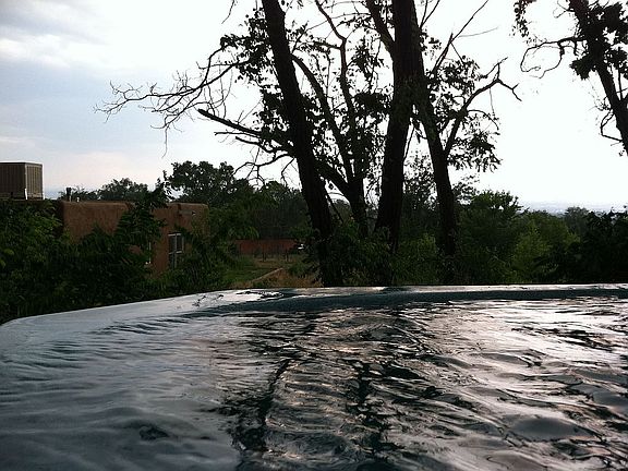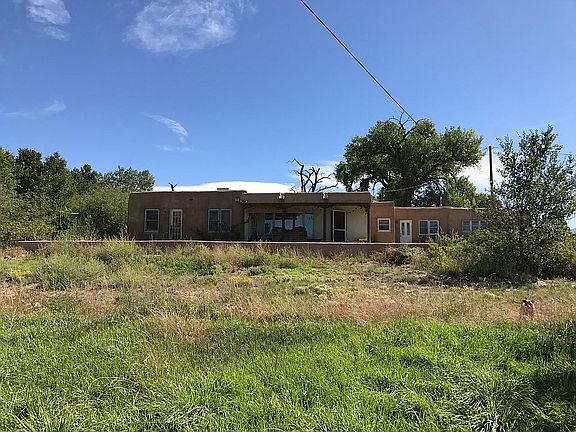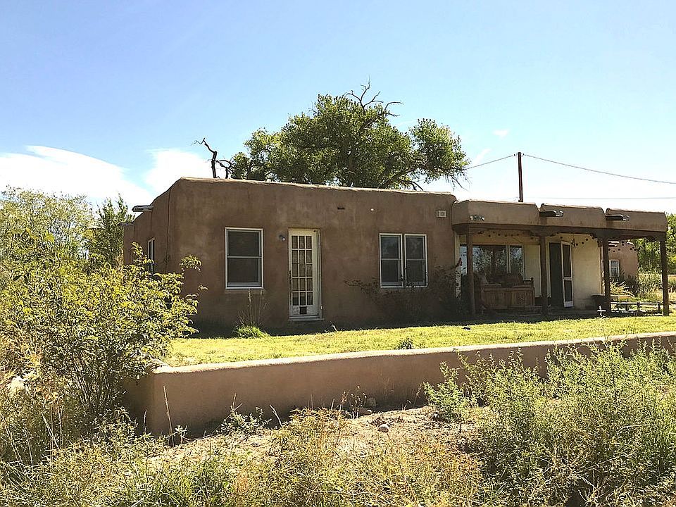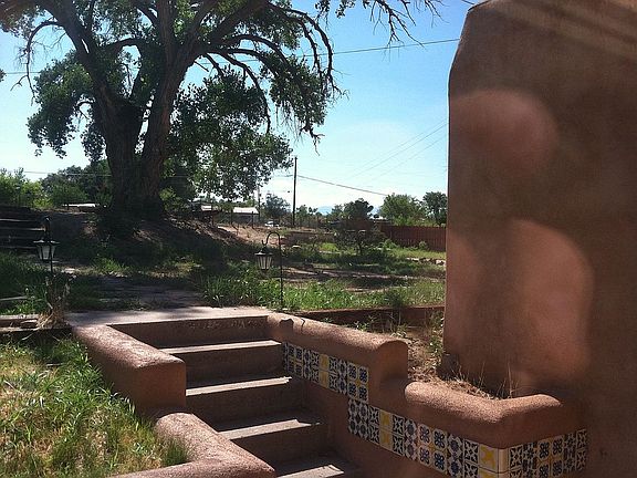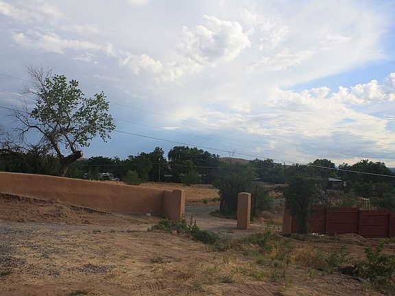 Adobe Pueblo Style Estate in Santa Fe County with a Solid Adobe Boundary wall painted with running elk. The Adobe Main house features solid oak and marble floors with teak wood arches and tasteful touches throughout. The light and spacious living and dining rooms boast of large double paned windows, and with the extra office and large laundry room, this a perfect family home. 100k of upgrades make this property one of a kind. Original Mexican Tiles can be found all around the property, on the adobe covered retaining walls. Situated on a hill with a brick front porch with views of the Jemez mountain range, on 2.37 acres, with 2 acres of vacant tribal land between you and the nearest neighbors. Mature fruit trees, pines and cottonwoods line the land. The land stretches up to the corner behind the arroyo, and has privacy, with acres between any neighbors, The property has significant Water Rights and an Acequia/Arroyo flowing through the land, and a private well. The large Garage has fresh adobe walls, painted concrete floors, and a sliding door, as well as it’s own electrical meter. The additional wooden barn/shed has a finished room perfect for tools and projects, and space for animals and storage. The entire property is fenced in and secure, with three gates to access the main roads.