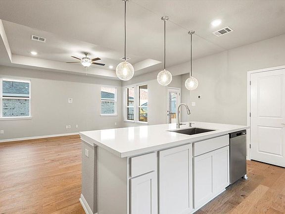 3 bed 2 bath Plus study in a beautiful Park Side on the river community ..This large single-story floor plan provides optimal space for your family. The kitchen is open to the family room which makes a great place to entertain family and friends! The outdoor covered living completes the hospitality ensemble. Take refuge in a sumptuous owner's suite nicely located on the opposite side of the house from the other bedrooms, enjoy the tranquility. The windows bathe the room in natural light with the bay window for additional floor space. The owner's bath includes dual sinks, a linen closet, and a large walk-in closet. The second and third bedroom share a lovely bathroom, and the study is perfect for quiet time while working from home. Structural options added at 204 Green Knoll include: 12" pop-up ceiling at gathering, full gutters, bay window at owner's suite, covered outdoor living, pre-plumb for future water softener, and gas stub out.