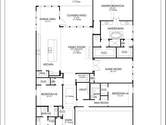 Entry with 12-foot ceilings. Game room with French doors. Kitchen features a large island with buit-in seating space that opens to a dining area. Family room with a wall of windows. Master suite with three large windows. Double doors lead to master bath with dual vanities, garden tub, a separate glass-enclosed shower, and two large walk-in closets. Covered backyard patio. Mud room leads to the 3-car garage.