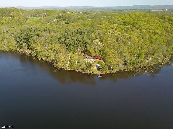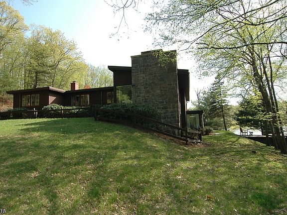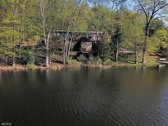 Mid-century modern redwood and stone home nestled on 13.5 serene acres bordering a 90 acre private lake. Property is completely surrounded by forest or lake and is perfectly angled to permit a sweeping view of the water only steps away from the front door. Enter the home through stately double doors into a welcoming foyer. An entertaining room which features picture windows, Abercrombie & Fitch mahogany wet bar with 10 stools, and a stone fireplace. Polished brass banister leads to the impressive great room overlooking deck and boat house adored with beamed ceilings and wood burning fireplace. The formal dining room leads to the charming sun room. The restored working kitchen is bright and cheery with plenty of cabinet space. Three bedrooms, two walk in closets and a spacious Master suite.