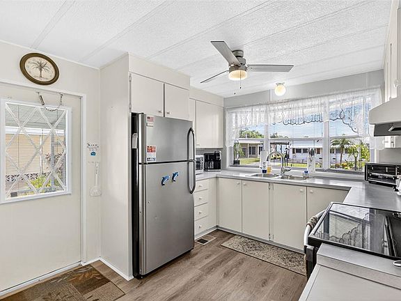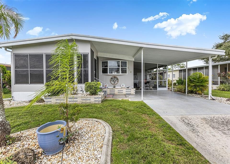 Welcome to this delightful two-bedroom, two-bathroom home, perfectly situated near the front of the park! As you step inside, you'll be greeted by a charming dining room featuring a lovely built-in hutch, ideal for showcasing your favorite decor. The kitchen is outfitted with newer stainless steel appliances and a spacious double stainless steel sink, making meal preparation a breeze. Cozy up in the inviting living room, complete with a warm fireplace, or step outside to the vinyl-enclosed Florida room that boasts a beautiful tiled floor—perfect for relaxing or entertaining. The guest bedroom is carpeted for comfort and includes a double closet and a mounted TV for your enjoyment. The guest bathroom thoughtfully combines convenience with style, offering a vanity and a cozy tub/shower combo. Retreat to the spacious primary bedroom, featuring its own dressing area with a double closet and a stylish vanity. The primary bathroom is a refreshing oasis, featuring a modern walk-in shower. Outside, the carport driveway is partially coated in epoxy and leads to a screened lanai with a matching epoxy floor. The utility room is equipped with a washer, dryer, deep sink, workbench, and storage shelves for all your needs. With ceiling fans, air conditioning, a humidistat, and numerous upgrades—including a new water heater in 2023 and a roof replacement in 2021—this home is truly ready with comfort and efficiency for its lucky new owners. Come see for yourself! La Casa offers the ultimate lifestyle on Florida’s Gulf Coast and is located between Sarasota and Fort Myers. It is convenient for shopping, sightseeing, golfing, fishing, and boating, as well as all the culture and elegance for which the Southwest Florida area is noted. Residents and visitors enjoy the warmth of Southwest Florida winters in a relaxed and unhurried environment far removed from the hustle of Florida’s east coast. You’ll be surrounded by hundreds of palms reaching for the sky and beautiful mature lush landscaping which demonstrates the utmost level of care our property receives from residents and management. La Casa boasts two pools, maintained at a perfect 87 degrees, two hot tubs as well as a dry sauna. Wireless Internet (Wi-Fi) is available at the Clubhouse, Activity Building, and Recreation Hall area where our pools & spas are located, so you can catch some rays while you catch up on your email! Sound enticing? La Casa is a friendly, family community. You will be away from the hustle and bustle except when you want to be part of it. When you leave our gates, North Port is only 1.5 miles from the city center, where you will find every kind of retail store and service you could need. Come for a visit to this self-contained oasis and see for yourself why La Casa is the ultimate destination for both snowbirds and year-round.