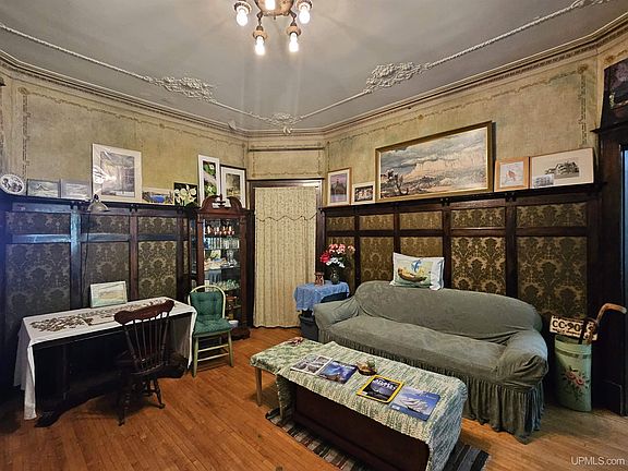 A timeless Victorian beauty. This house boasts so many original, unspoiled details like 4 fireplaces, decorative molding on the parlor ceiling, hard wood floors throughout and wood inlay design in a bedroom, pillars flanking the entrance to the living room, a grand staircase to the 2nd floor, and so much more. You'll enjoy the impressive, recently rebuilt, wrap-around porch. Have a quiet cup of coffee to welcome the day or entertain friends on this private, covered porch. Take advantage of the seasonal view of Portage Canal. The first floor features a parlor with fireplace, living room, library/den with fireplace, kitchen, dining room, and laundry room. Up a few steps from the first floor is a functional 3/4 bath. The second floor features 5 bedrooms (2 of which are 'suites' with 2 rooms) with non-functioning sinks, a fireplace in one bedroom, and a currently non-functional full bath with separate tub and walk-in shower. The attic offers plenty of storage space and servants' quarters with a fireplace making it a unique space to enjoy. Newer roof and water heater. Exterior chimneys have been rebuilt. The basement is high and dry. Located in the heart of Hancock, next to Montezuma park, within walking distance to downtown and the waterfront. Most of the contents of the attic and basement will stay. Some items in the remainder of the house may stay as well. House needs some work. Move in and complete your projects in your own time. This information has been secured from sources we believe to be reliable, but we make no representation or warranties, expressed or implied, as to the accuracy of the information. References to square footage, lot size/dimensions, and age are approximate. Buyer must verify the information and bears all risk for inaccuracies. Taxes will change with the sale.