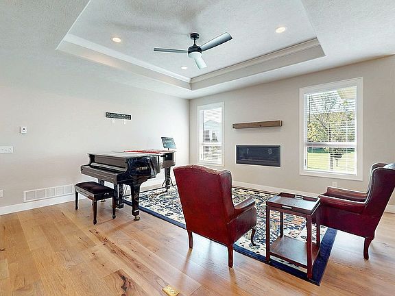 Living room has a linear gas fireplace and tray ceiling.