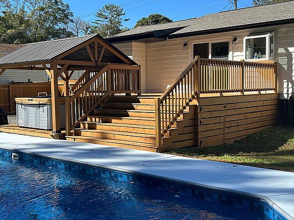 Step outside through sliding doors to a large deck overlooking the newly fenced backyard, perfect for entertaining. Enjoy a 20x40 in-ground pool, a spacious jacuzzi hot tub under its own gazebo, or relax by the cozy firepit.