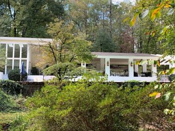 SOLITUDE, SERENITY, SAFETY, Spectacular Mid-Century Home in style of Frank Lloyd Wright designed by famous Augusta architect John Sandeford and featured in Augusta Georgie Magazine. Idylic setting on 24 acres bordering centuries old rock creek with discreet falls. Entire creekside and forest side of approx. 5, 000 sq. ft. home is glass with extraordinary views and wildlife sightings. Cypress paneling and mirrored section of both living and dining room with black terrazzo floor throughout. Huge Master with balcony toward Cedar Creek, 4 BR and 4 Baths. Fireplaces, large sauna, primary ktichen with new appliances and a second kitchen. New carpet in Master, Guest Room, Foyer, 2 extra bedrooms. All complemented by custom 45 x 25 newly restored pool with elegant features. 35 minutes to Augusta, Georgia for Masters. Open Car Port will accommodate 4-6 vehicles.